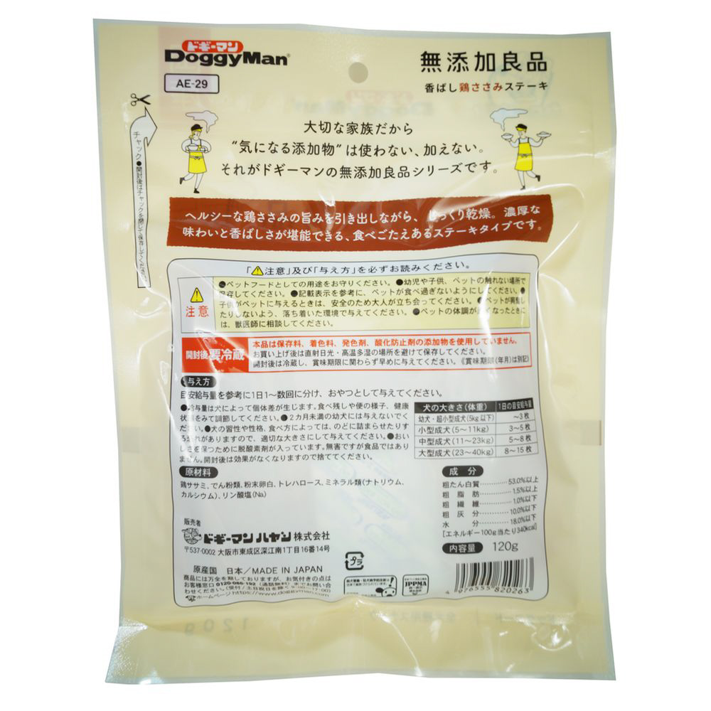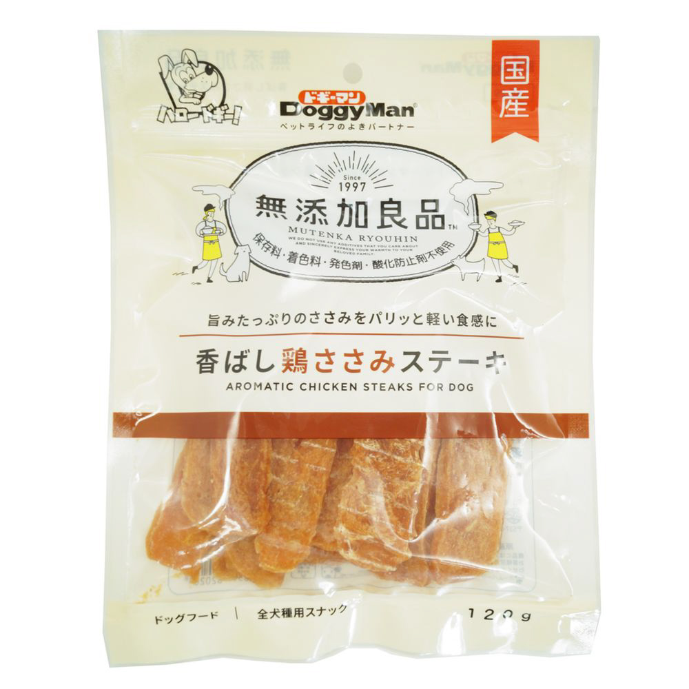 ・鶏本来の旨さを味わえる。ササミを練ってシート状にしたステーキ。無添加良品。・鶏肉の中で最も低脂肪なササミを使用したヘルシーなおやつ。・ササミ特有の甘い香りが愛犬を魅了する。・ちぎっても与えやすくしつけのトレーニングにも最適。・保存料、着色料、発色料、酸化防止剤を使用しない無添加良品シリーズ。