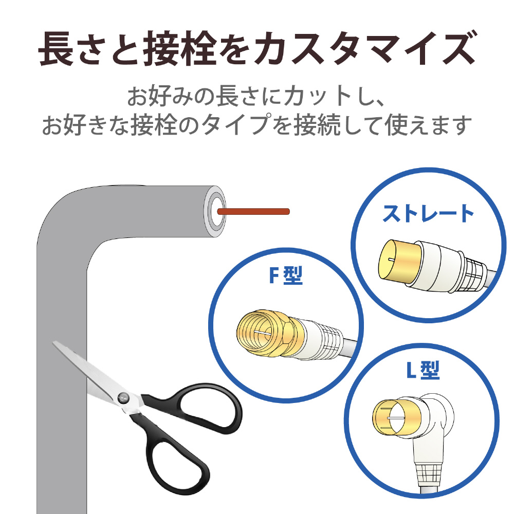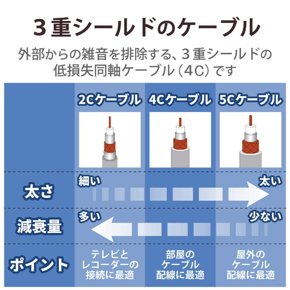 既存の2K放送から4K・8K(3224MHz)放送まで対応した製品です。テレビ電波を効率よく伝えるアンテナ線です。宅内アンテナ配線用に最適です。ケーブル長30m。