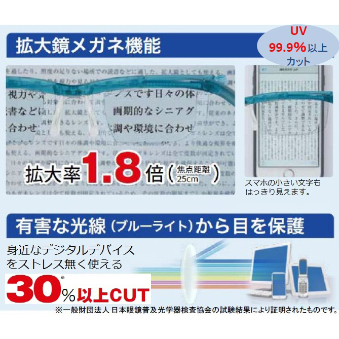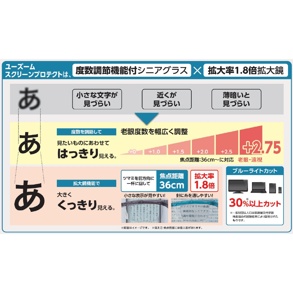 ユーズームスクリーンプロテクトは、度数調節機能付シニアグラス×拡大率1.8倍拡大鏡。ブルーライト30%以上カット。