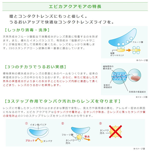 レンズに付着したタンパク汚れはさまざまな要因で変性し、見え方や装用感の悪化、アレルギー症状の原因にもなるのです。エピカ アクアモアは1.タンパク付着防止、2.タンパク除去、3.レンズに残ったタンパク質の変性防止の3つのステップでレンズをタンパク汚れから守ります。