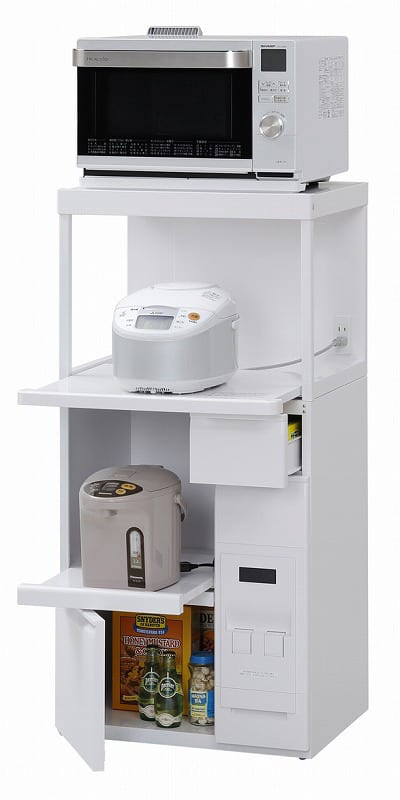 炊飯器やポットを使いやすく収納、米びつがついた家電ラック。