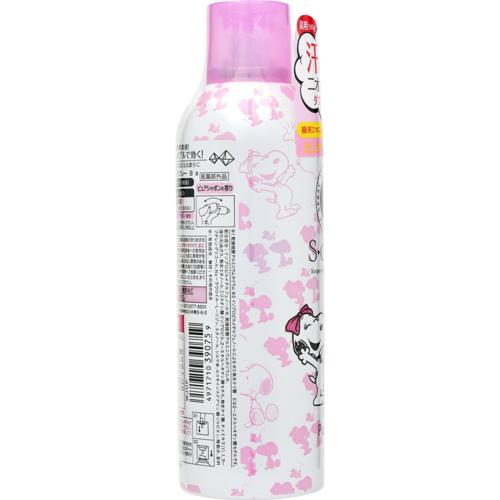 全身手軽にシューッとするだけで、汗をとめて殺菌。ミョウバン配合でニオイ、汗をブロックしワキ・胸もと・首すじ・背中・脚などをカラッと快適に。ピュアシャボンの香り。