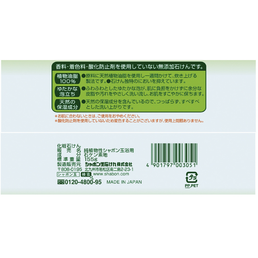 | 商品名 | 純植物性シャボン玉浴用バスサイズ (155g) 〔ボディソープ(固形石鹸)〕 |