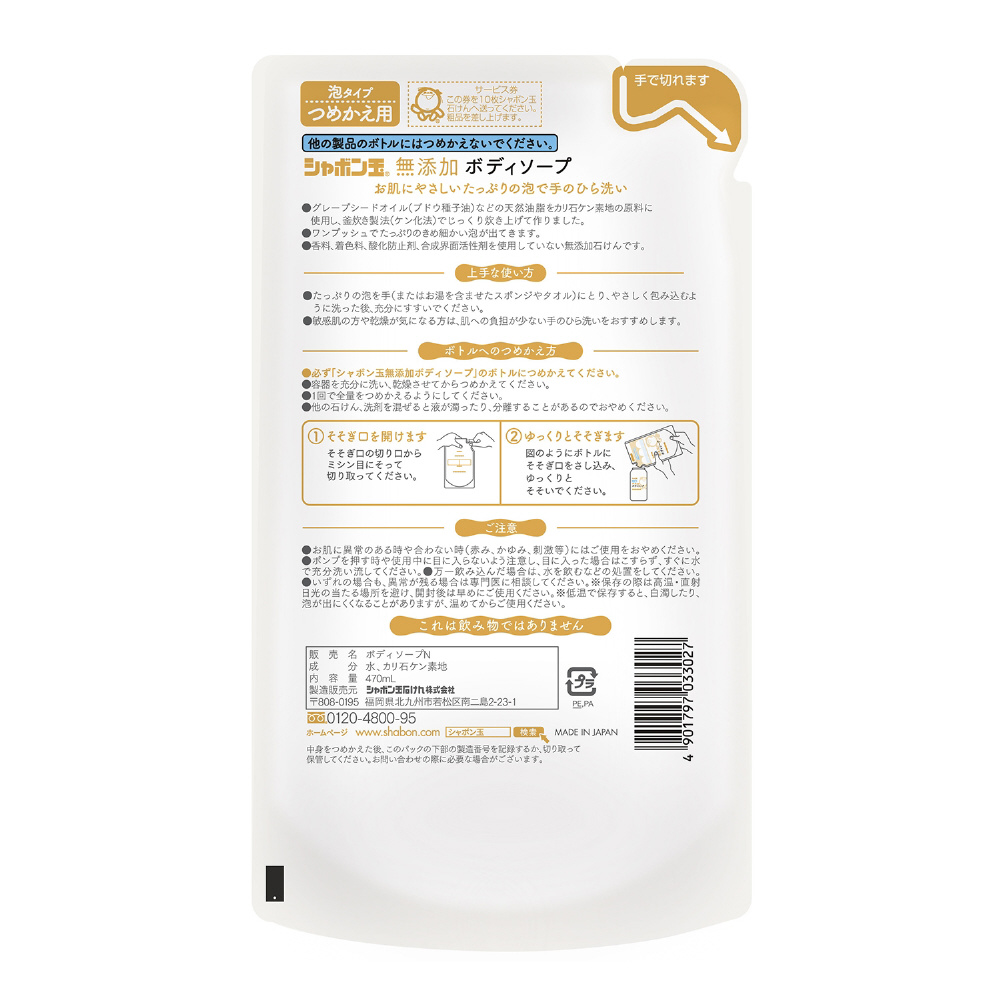 | 商品名 | シャボン玉 無添加ボディソープたっぷり泡つめかえ (470ml) 〔ボディソープ〕 |
