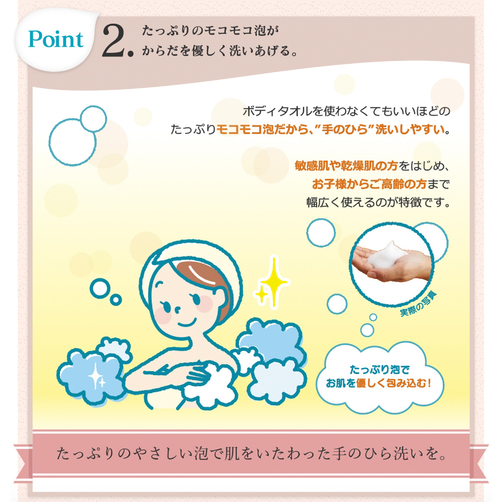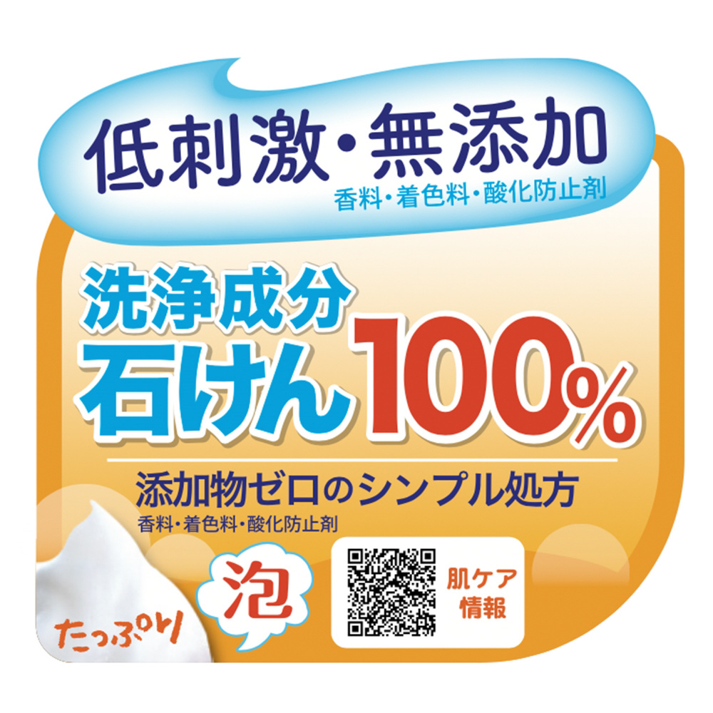 ●香料・着色料・酸化防止剤・合成界面活性剤不使用の無添加石けん。●昔ながらのケン化法で製造。●天然の保湿成分、グリセリンが含まれるためお肌にやさしい。●3mL吐出の(従来品は1mL)たっぷり泡タイプ。●“手のひら”洗いしやすい。●たっぷり泡で安定度の高いボトルなので、お子様からご高齢者まで使いやすい。●皮ふアレルギーテスト済/皮ふ刺激テスト済み
