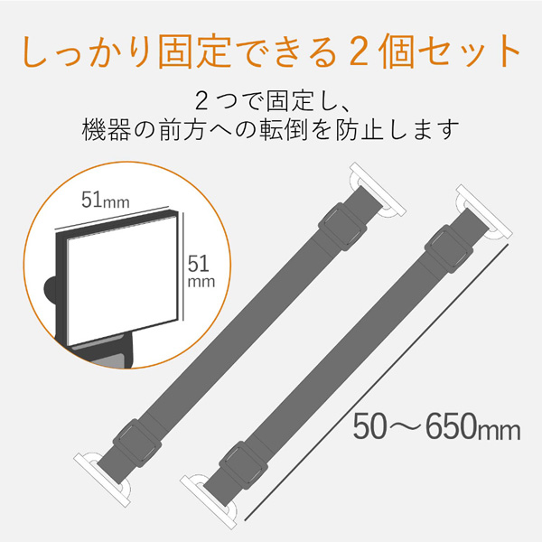 ■地震対策に!震度7相当の振動試験もクリアした、設置台や壁面に穴を開けずにテレビや周辺機器の前方への転倒を防止する”粘着シールタイプの耐震ベルト”です。■東日本大震災・熊本地震など震度7相当の振動試験をクリアしています。■固定パーツ間のベルト長さを調整して、一方を機器背面に取り付け、反対側を設置場所や壁面に貼り付けることで、前方への転倒を防止します。■ベルト長を調節できるので設置場所を選びません。■粘着を安定させるため、設置後72時間は動かさないようにしてください。