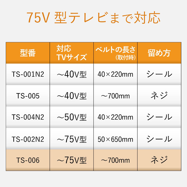 | 商品名 | TV用耐震ベルト/~75V用/ネジどめタイプ(VESA穴)/2本入 TS-006N |