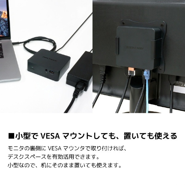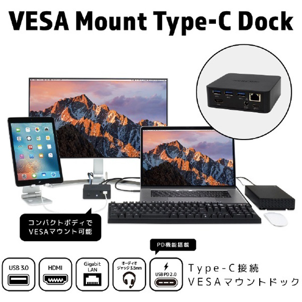 小型でVESAマウントが可能なType-Cドッキングステーション。HDMI、LAN、イヤホン、USBがつなげる!PD充電も!