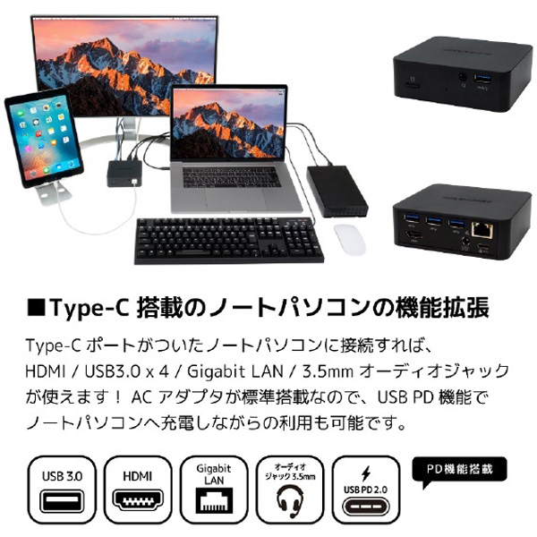 VESAマウントType-Cドック USB PD2.0対応 AS-DCS01 HDMI/USB3.0×4/Gigabit LAN/3.5mmオーディオジャック