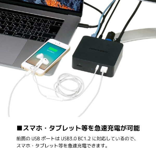 前面のUSBポートはUSB3.0 BC1.2に対応しているので、スマホ・タブレット等を急速充電できます。