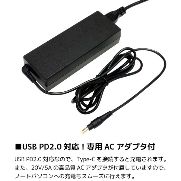 また、20V/5Aの高品質ACアダプタが付属していますので、ノートパソコンへの充電もスムーズに行えます。