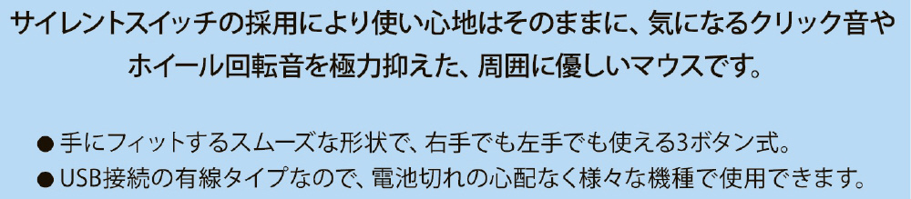 ■サイレントスイッチの採用により使い心地はそのままに、気になるクリック音やホイール回転音を極力抑えた、周囲に優しいマウスです。