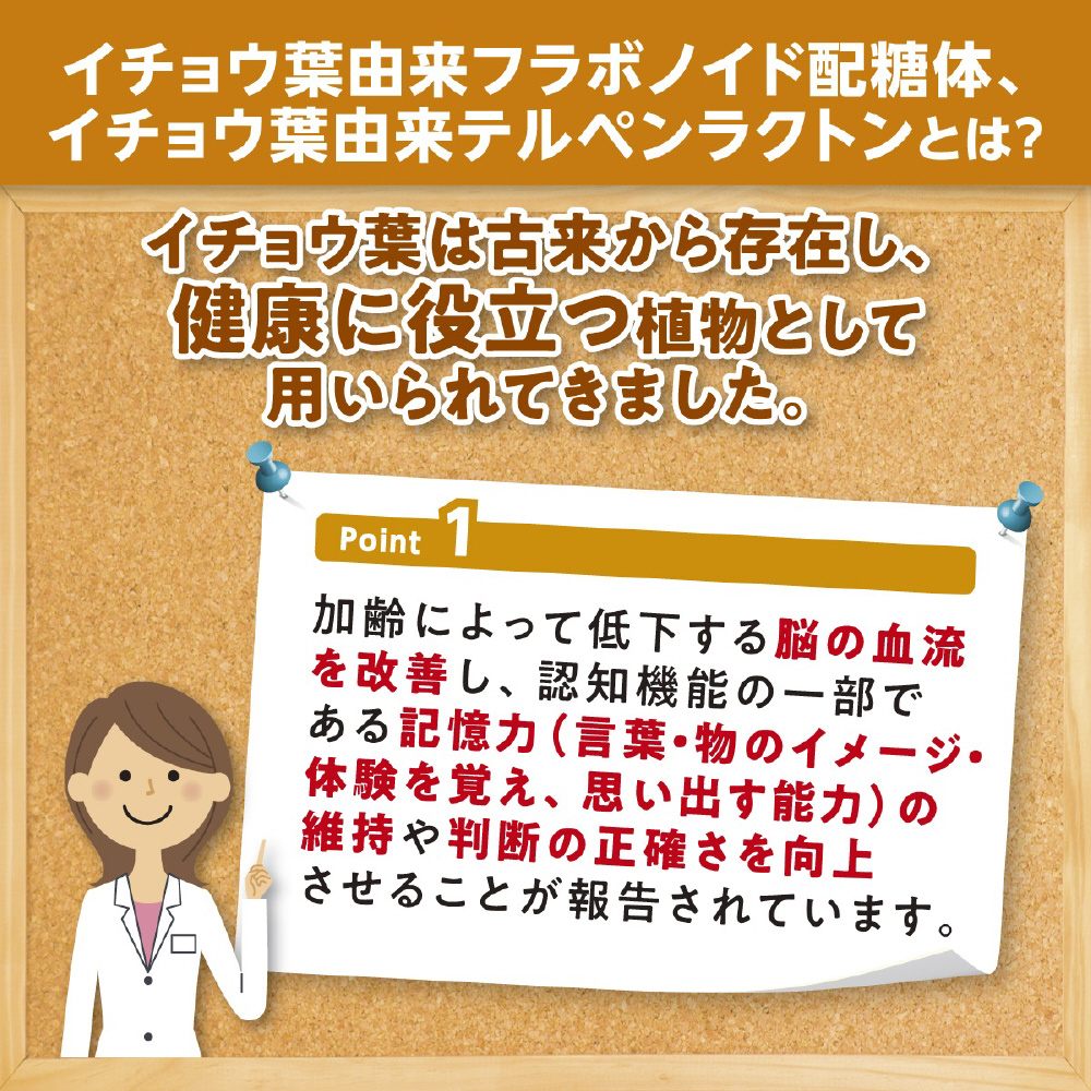 「イチョウ葉 脳内α」は、機能性関与成分[イチョウ葉由来フラボノイド配糖体]、[イチョウ葉由来テルペンラクトン]を配合した【機能性表示食品】です。加齢によって低下する脳の血流を改善し、認知機能の一部である記憶力の維持や、判断の正確さの向上をサポートします。
