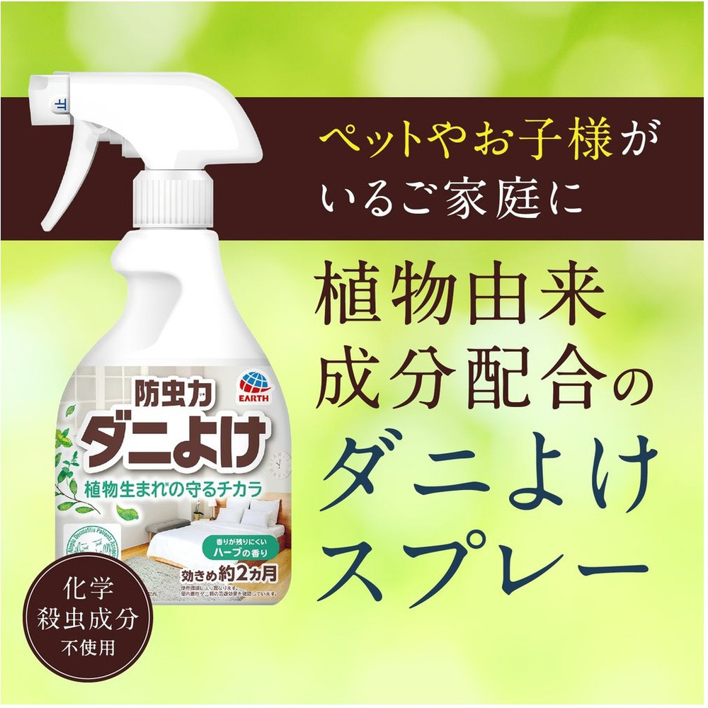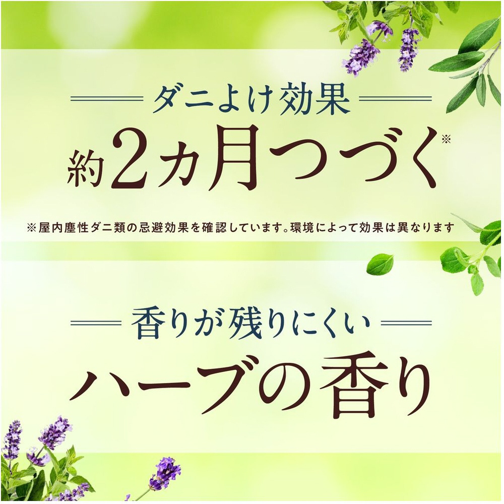 | 成分 | 植物由来成分(ダニよけ成分)、孟宗竹抽出物(除菌成分)、緑茶エキス(消臭成分)、ハウスダスト除去成分、エタノール、香料 |