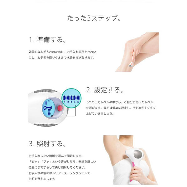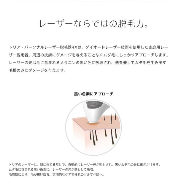 プロレベルの脱毛がご自宅でできる脱毛器。FDA認可済みで美容のプロが推奨するトリア・パーソナルレーザー脱毛器はクリニックで使用されているダイオードレーザー脱毛技術を応用しています。肌への負担が少ないから安心して使えます。
