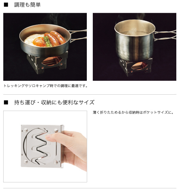 | 仕様3 | 【主素材】ステンレス 【構成】コンロ本体、燃料受け皿 |
