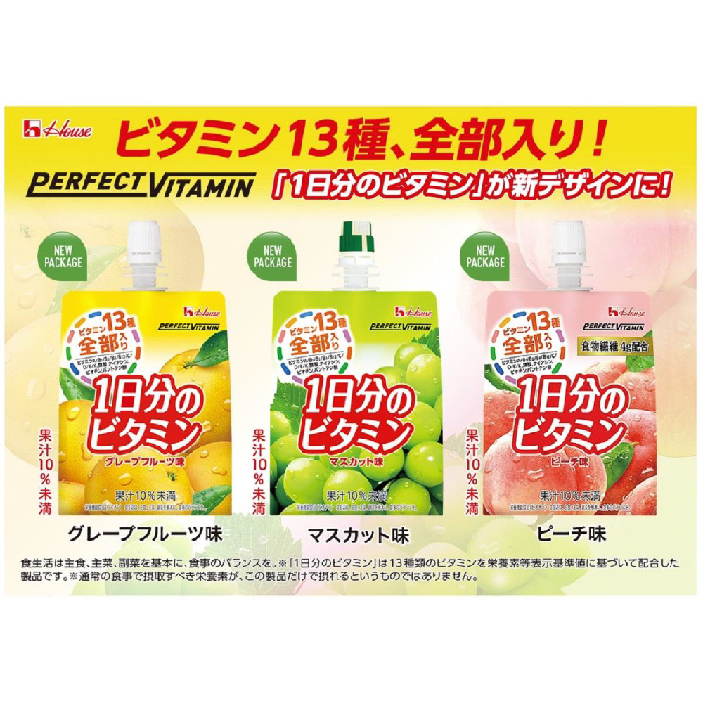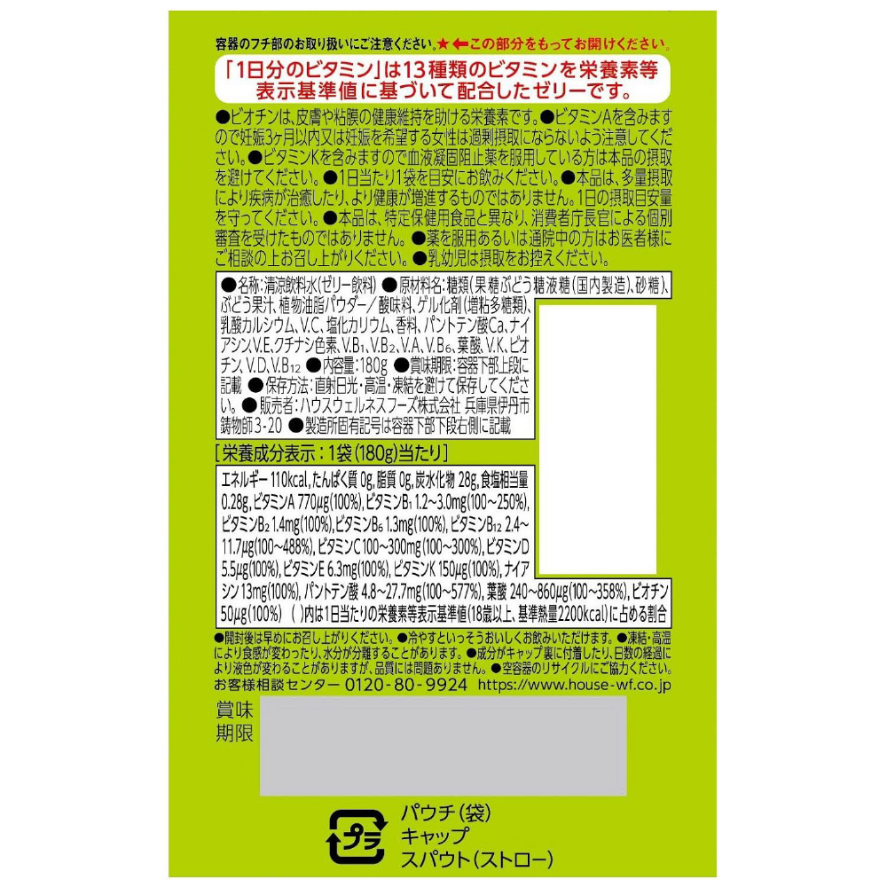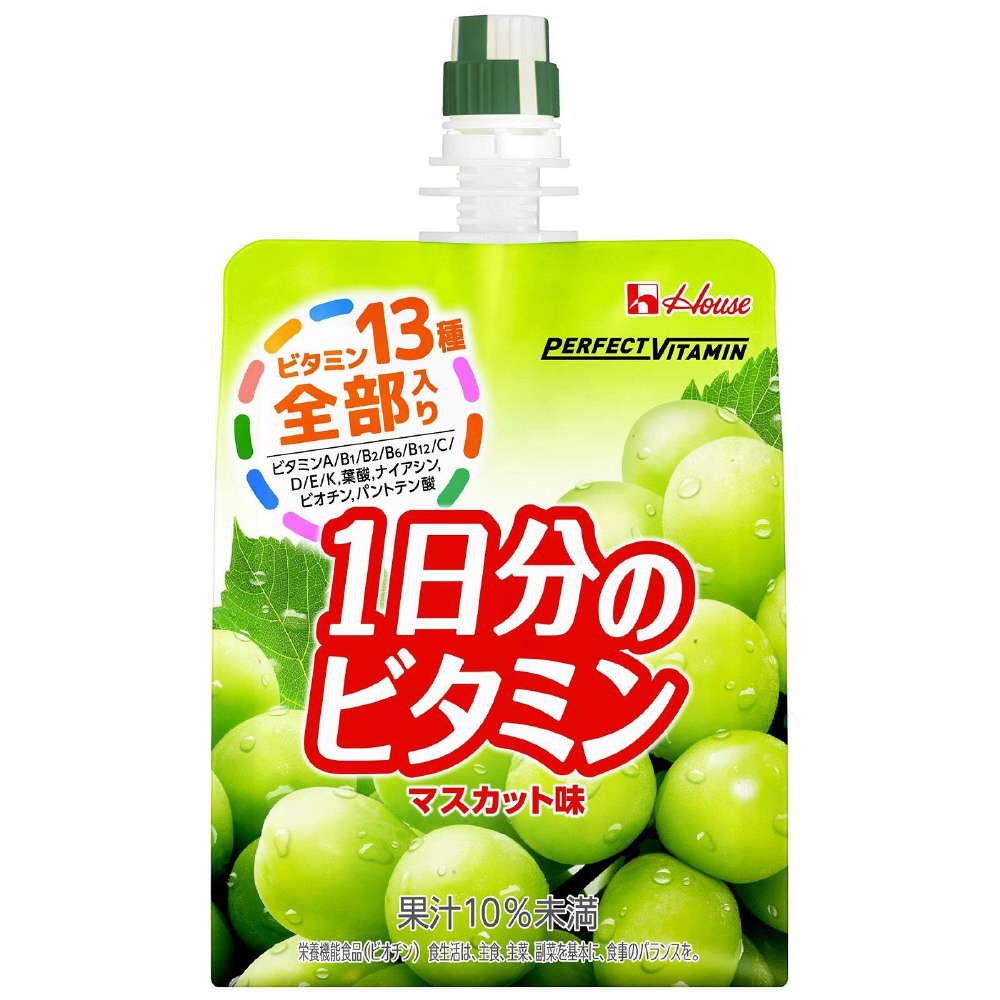 栄養素等表示基準値(2015)に基づき、ビタミン全13種類を配合。1日に必要なビタミン全13種類を1袋でしっかり補給することができる。人工甘味料不使用で果実らしい美味しさのマスカット味。 (果汁10%未満)小腹満たしに最適なゼリー飲料180g。
