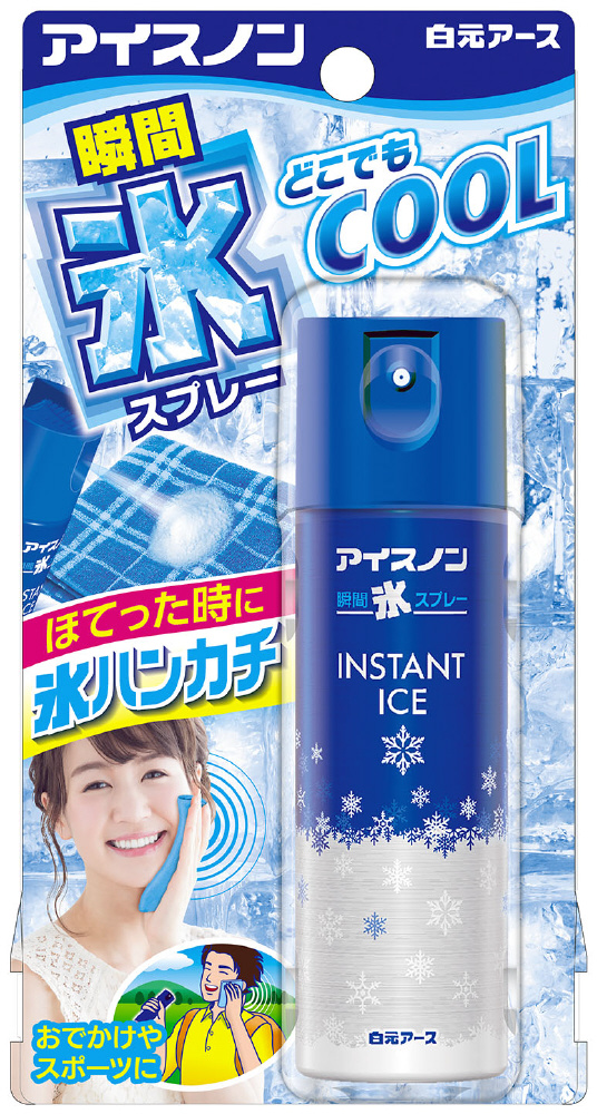 ハンカチなどにスプレーすると、ミストが氷状に変化。ほてった肌にあてるだけで瞬間冷却。いつでもどこでも使える携帯サイズ。夏のおでかけ時やレジャーに。