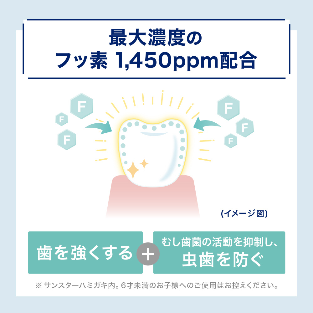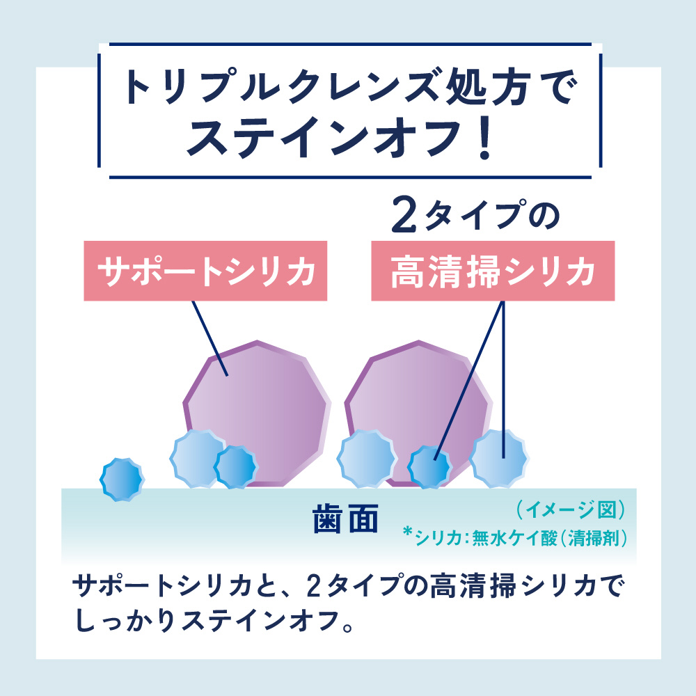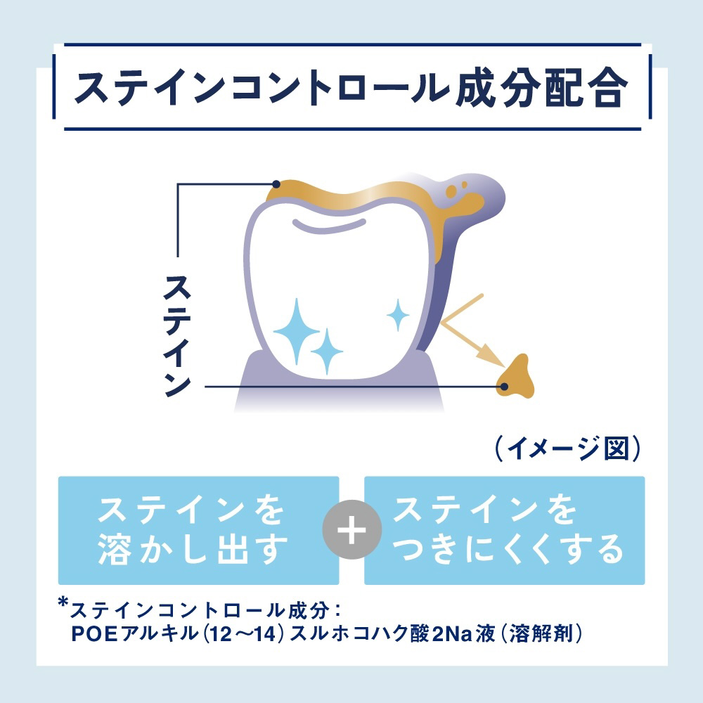 サポートシリカと2タイプの高清掃シリカで、しっかりステイン(着色汚れ)を除去。さらに、ステインコントロール成分(溶解剤)がステインに染み込み、溶かし出すとともに、ステインをつきにくくします。爽やかなハーブがやさしく香る、「ナチュラルミント」フレーバー。