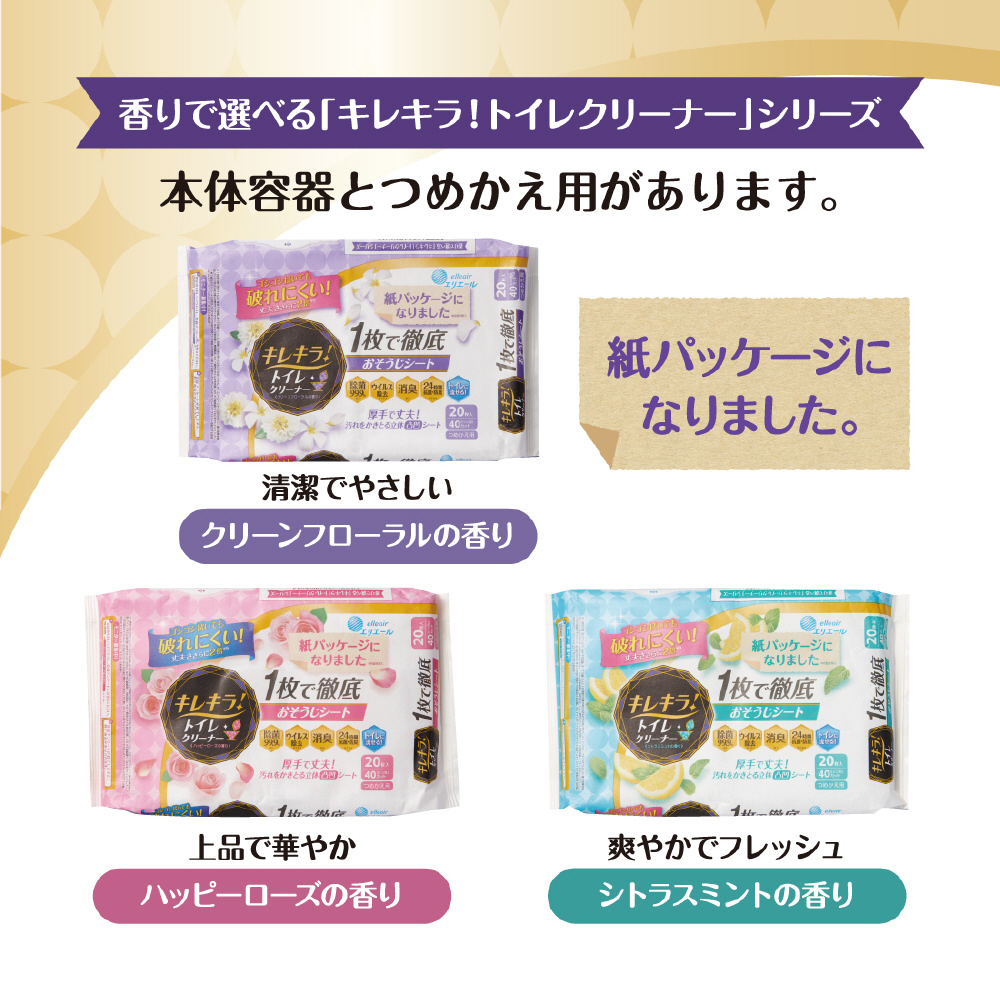 | 商品名 | elleair(エリエール) キレキラ!トイレクリーナー 1枚で徹底お掃除シート ハッピーローズ つめかえ用 (20枚) 〔トイレ用掃除シート〕 【864】 |