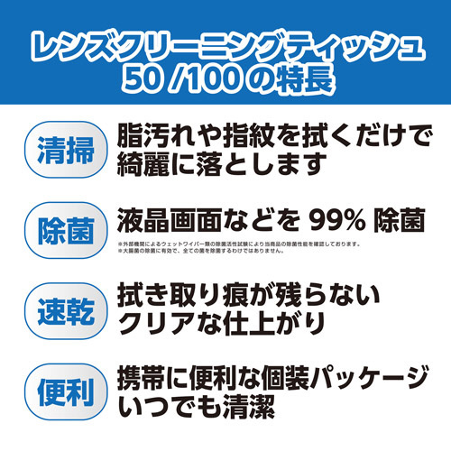 液晶画面やファインダーなど体の触れる部分を清潔に保つ、除菌率99%以上のクリーニングティッシュです。外部機関によるウェットワイパー類の除菌活性試験により、除菌性能を確認済みです。※大腸菌の除菌に有効で、全ての菌を除菌するわけではありません。