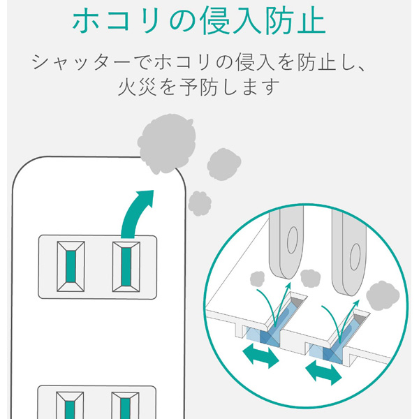 未使用時にほこりの侵入を防止する「ほこり防止シャッター」付き!テレビ周りでの使用に便利な、ほこり防止シャッター付電源タップ。