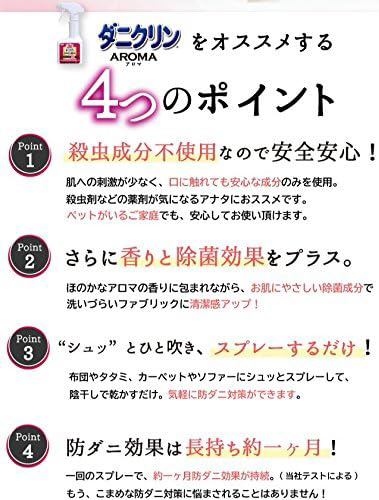 スプレーするだけで、ダニをよせつけにくい効果。殺虫成分は一切使用していません。肌への刺激も少なく、安全性に配慮しています。効果は約1ヶ月持続。除菌効果もプラス。爽やかなシトラスの香り。
