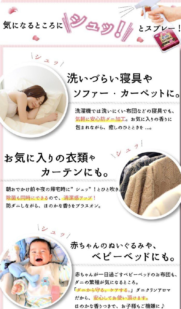 スプレーするだけで、ダニをよせつけにくい効果。殺虫成分は一切使用していません。