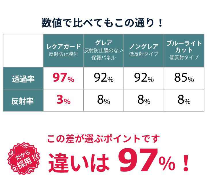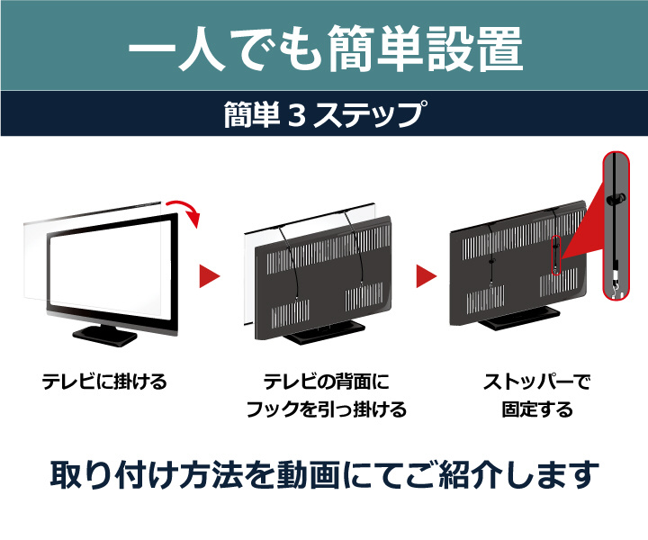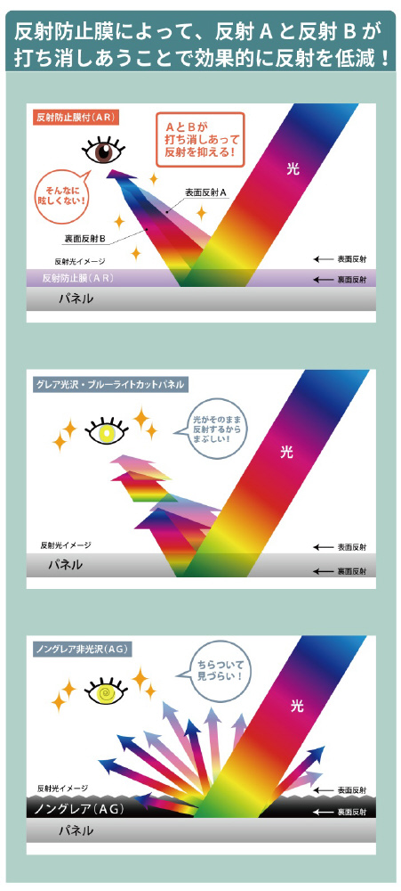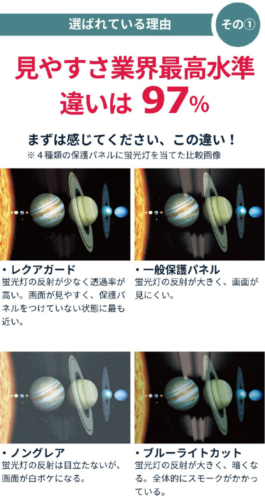 外部からの衝撃に弱い液晶テレビ画面を保護し、反射防止膜(ARコート)により、画面への映り込みを低減します。