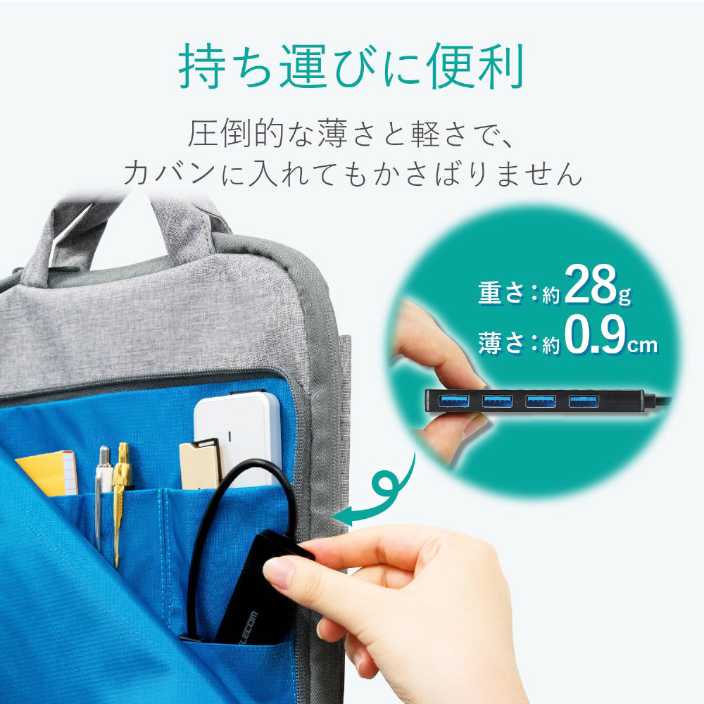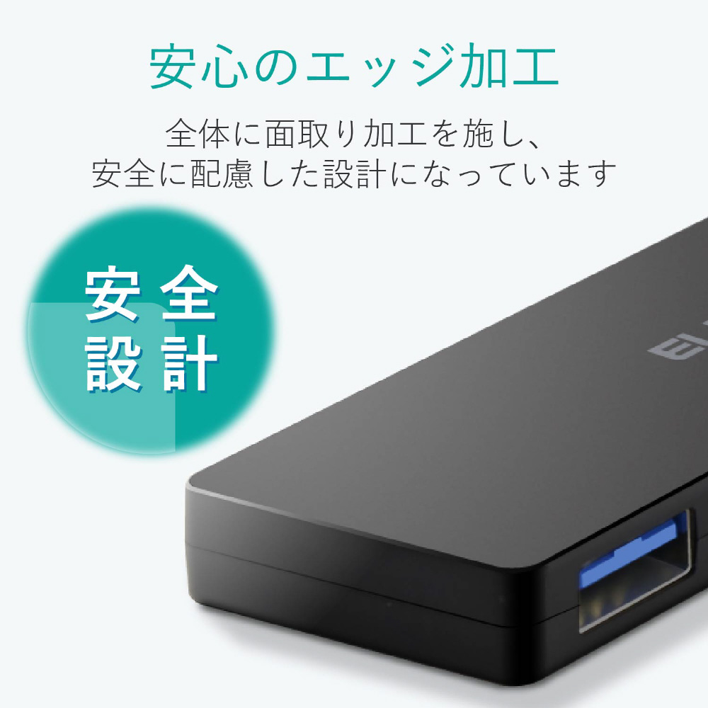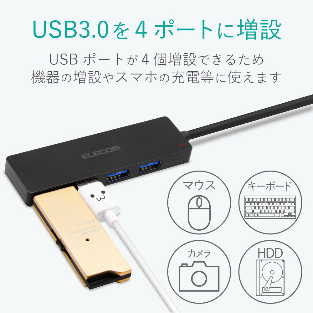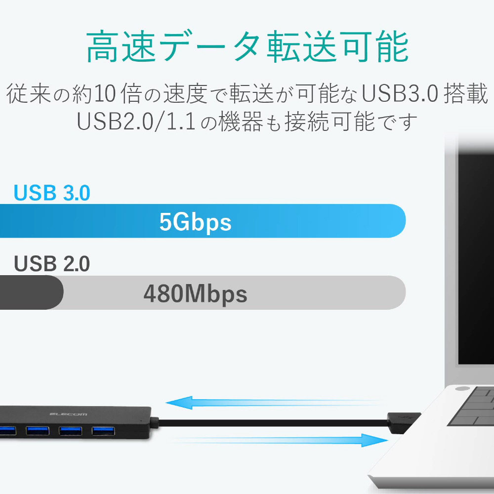 ■インターフェイス:USB3.0(USB2.0インターフェース接続時は、USB2.0互換で動作、USB1.1インターフェース接続時はUSB1.1互換で動作) ■コネクタ形状:パソコン側(アップストリームポート):USB A(オス)×1、USB機器側(ダウンストリームポート):USB A(メス)×4 ■対応OS:Windows 10、8.1、7(SP1)/ macOS High Sierra(10.13) ※各OSの最新バージョンへのアップデートや、サービスパックのインストールが必要になる場合があります。 ■最大転送速度:USB3.0スーパースピード/5Gbps(理論値)、USB2.0ハイスピード/480Mbps(理論値)、USB1.1フルスピード12Mbps(理論値) ■アップストリーム(パソコン側)ポート数:1 ■ダウンストリーム(周辺機器側)ポート数:4 ■USBケーブル方式:USB3.0 ■USBケーブル長:約7.0cm(コネクタを除く) ■電源方式:バスパワー ■供給可能電流:USB3.0接続時:4ポート合計720mA以内(各ポート180mA未満)、USB2.0接続時:4ポート合計400mA以内(各ポート100mA未満) ■カラー:ホワイト ■外形寸法:約幅100.0×奥行28.0×高さ9.7mm(ケーブルを除く) ■重量:約26.0g ■動作環境:温度5〜40℃、湿度30〜80%(結露なきこと) ■保証期間:6カ月