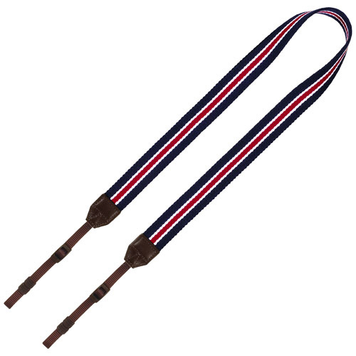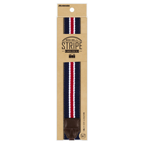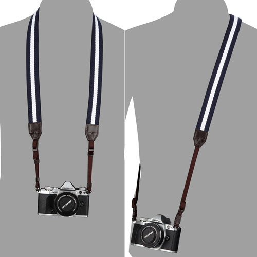 柔軟でファッショナブルなストライプ柄の幅広ベルトと、根革に先ヒモと色を合わせた本革を採用した一眼カメラ用ストラップです