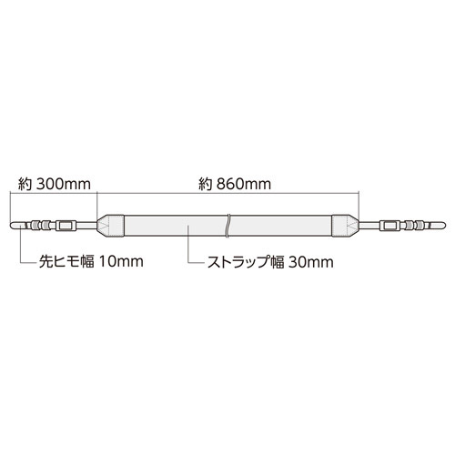 肩や首に触れる幅広ベルト部分は長さが約850mmあるのでどのような掛け方でも重さを分散してくれます。先ヒモ部分は長さ調整が可能で、取り付け部分と長さ調整用部品側をそれぞれ絞れるように2つのリングが付属しています。