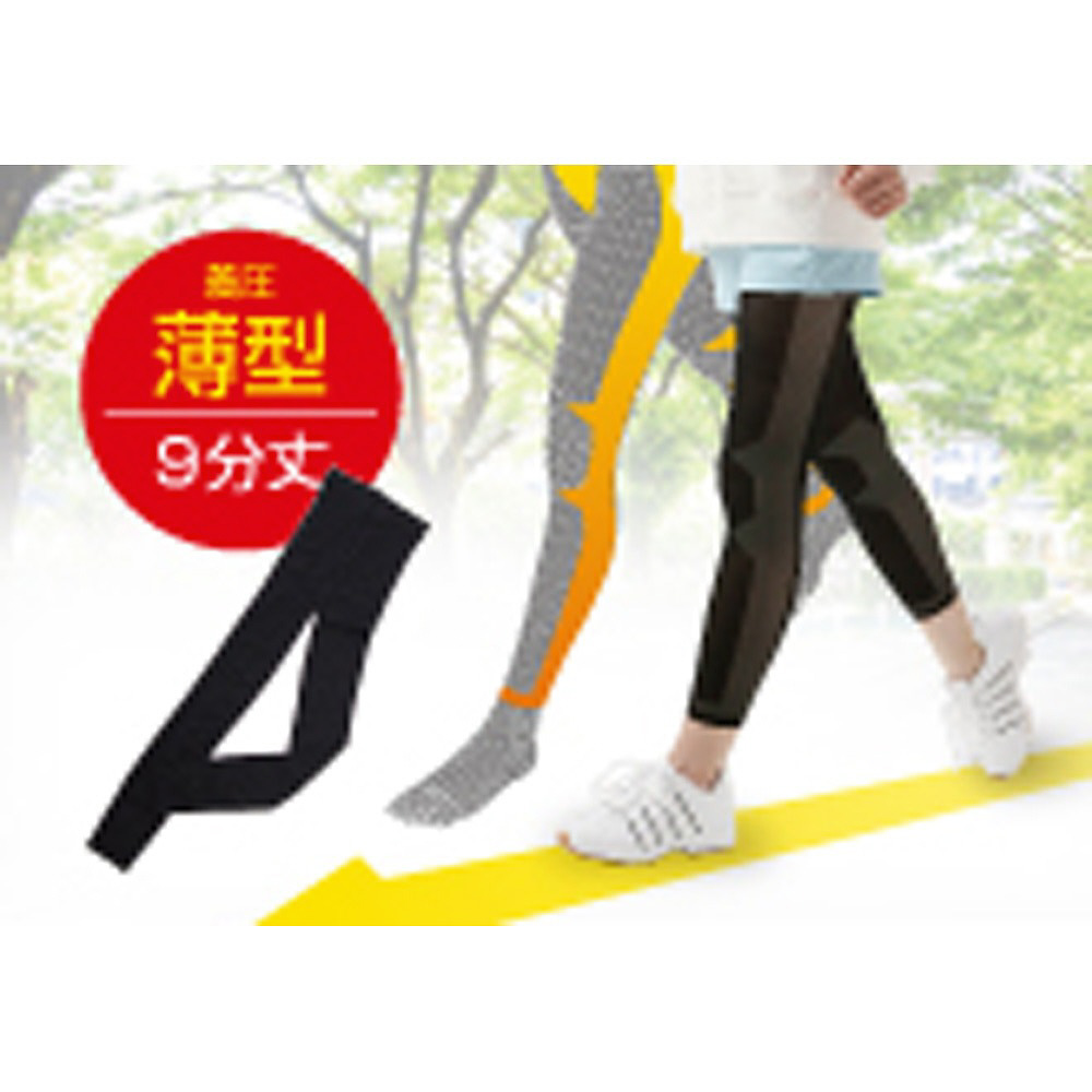 ひざまわりを囲むように施されたテーピングが歩きやすさをサポートします。薄型タイプなのでズボンの下にはいても快適です!