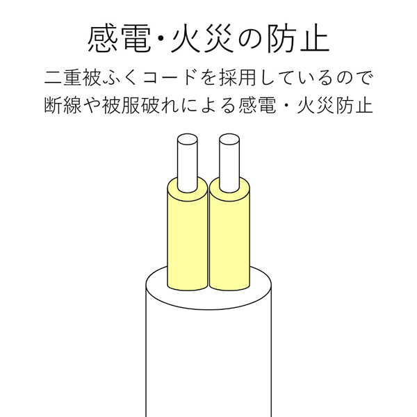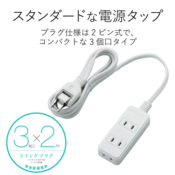 ■電源タップの基本性能をしっかり搭載し、オフィスやご家庭など、様々なシーンで使いやすいスタンダードな電源タップです。 ■差込口には耐燃性に優れたユリア樹脂を使用しており、万一の発熱の際にも融解しにくく、電気火災の防止に有効です。 ■電源コードは一般社団法人日本配線システム工業規格に適合した二重被ふくコードを採用しており、断線や被ふく破れによる感電・火災の防止に有効です。 ■プラグは狭い場所でも配線しやすい180度スイングプラグを採用しています。 ■プラグ仕様は2ピン式で、コンパクトな3個口タイプです。