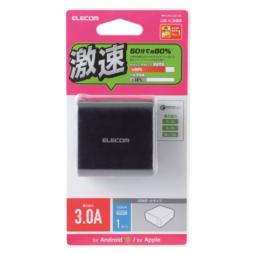 タブレット/スマートフォン対応 [USB給電] AC充電器 QuickCarge3.0対応 3A出力 USB1ポート MPA-ACUQ01BK