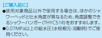 シャワーヘッド(エアイン)・使用対象商品以外で使用する場合は、他のシャワーヘッドと吐水角度が異なるため、角度調整できるシャワーハンガー(THYC51R)をおすすめします。・0.07MPa以上の給水圧(水栓根元・流動時)でご使用ください。