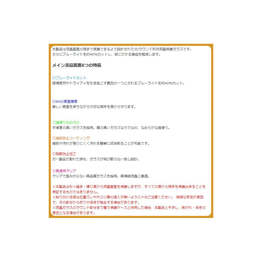 | 仕様1 | 液晶画面の端まで保護し、ブルーライトを軽減する3Dラウンド形状液晶ガラス |