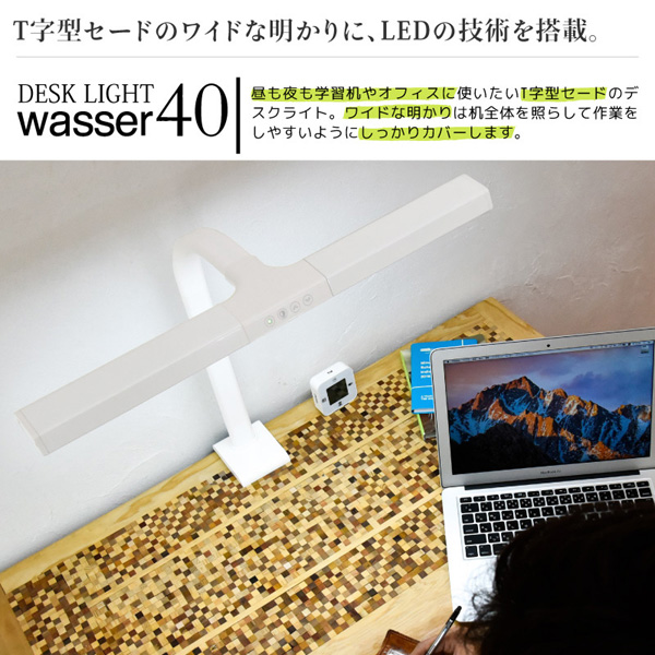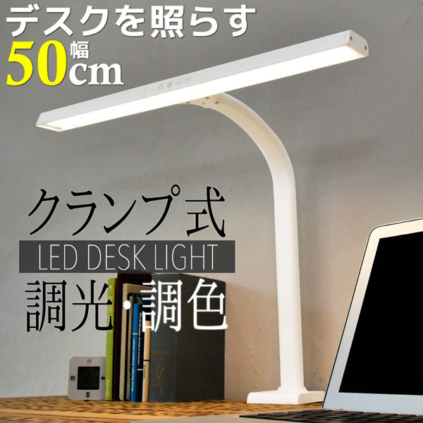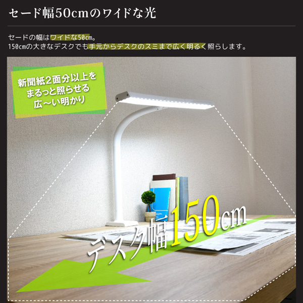 セード幅80cmの超広ーセードの本格クランプ式T字型デスクライト。その大きな実力派ボディにはLEDの技術や機能を搭載。3段階で約10-60mmの高さへ対応できるクランプ式なので学習机やオフィスデスクなどに簡単に取り付けられます。またセード部分は付属の六角レンチを使って取り外し、上下の付け替えが可能なのでクランプと合わせて幅広い用途でお使いいただけます。5段階調光に加えて、色温度も電球色・白色・昼白色・昼光色の4パターンに調色。用途に合わせて心地よい環境を作ってくれます。操作はタッチボタンのみで簡単。お子さまの学習机や読書、オフィスにオススメ。もちろんリビング学習にも。目に優しいLEDライトなので省電力で長寿命とってもエコに節電対策!電気代を気にせずに長時間使えるデスクスタンドライトです。