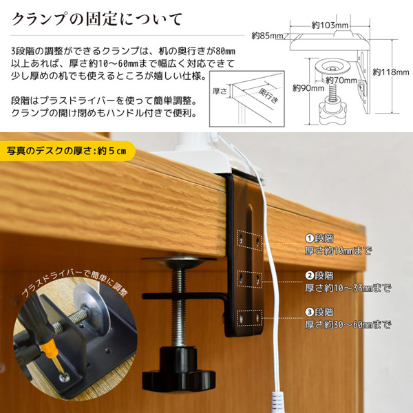 | その他サイズ | クランプ取付可能厚:約10mm以上60mm以下、奥行:80mm以上 |
