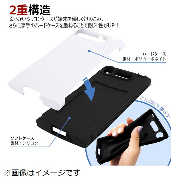 ■衝撃に強いシリコン素材と傷に強いポリカーボネイト素材を使用した2重構造の耐衝撃ケース。