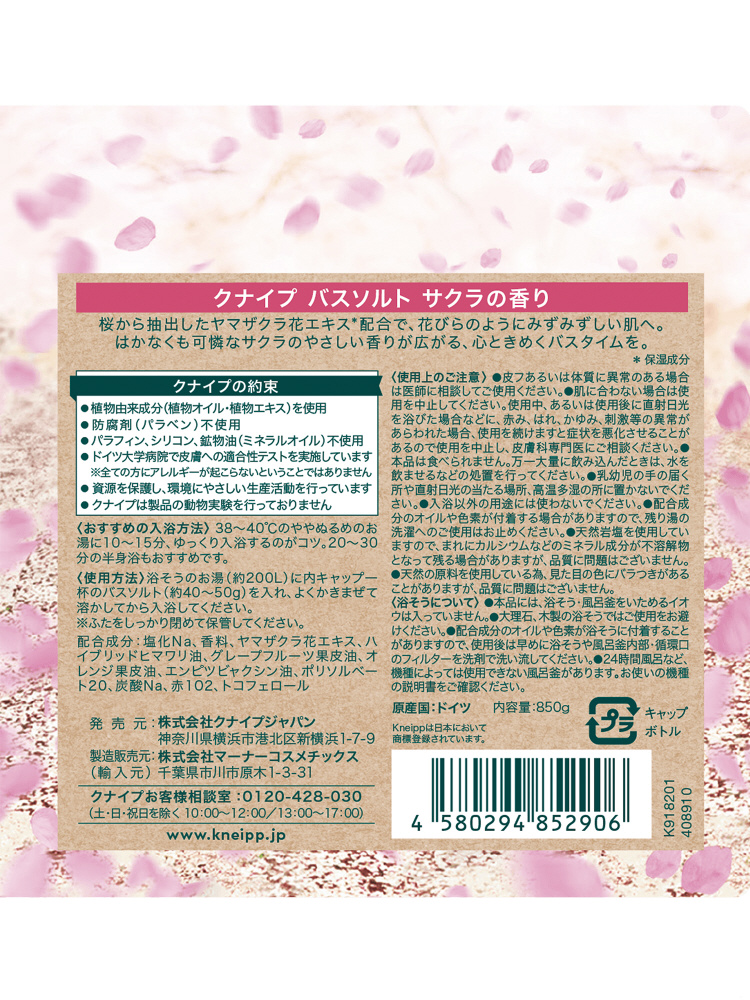 | 商品名 | KNEIPP(クナイプ)さくらの香り(850g) [入浴剤] |