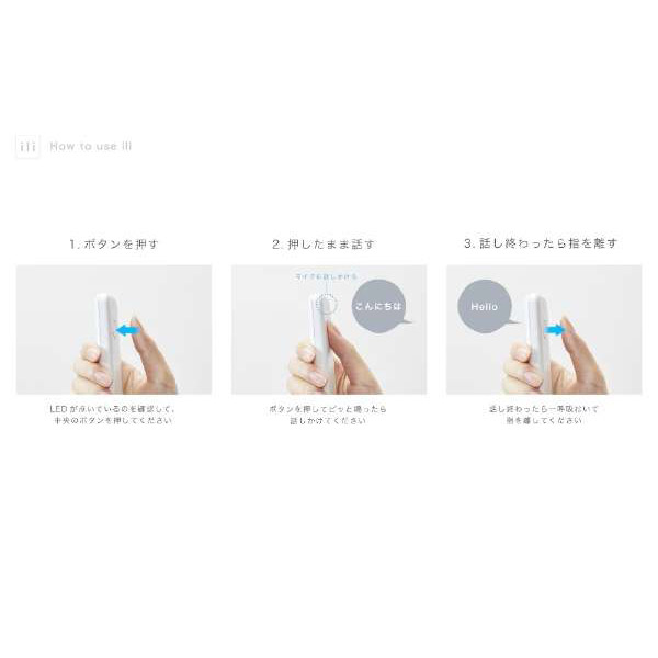 ili(イリー)は、旅行に特化した音声翻訳機です。 オフラインで使えて、最速0.2秒で、あなたが話した言葉を 英語を「日本語・中国語・スペイン語」の3言語に翻訳。 海外旅行をさらに楽しく、より安心にサポートします。