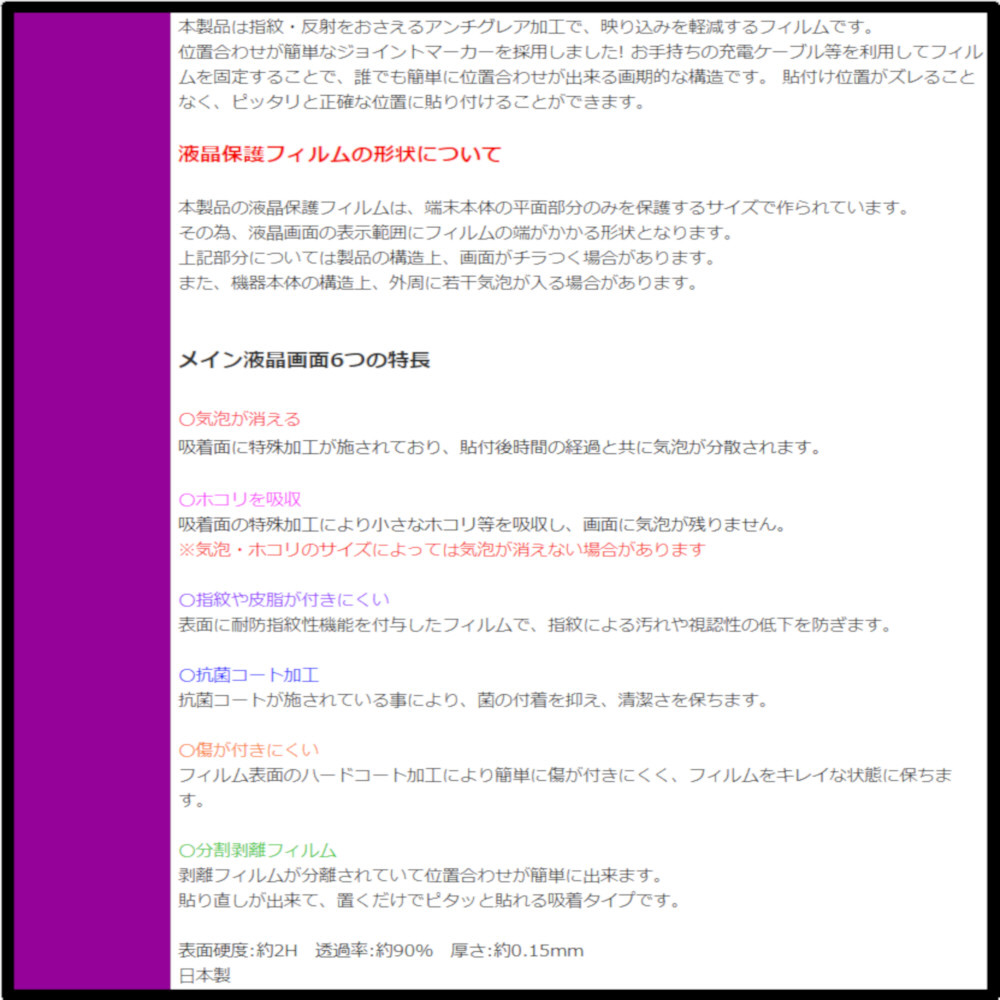 | 仕様1 | 指紋・反射をおさえるアンチグレア加工で、映り込みを軽減するフィルム |