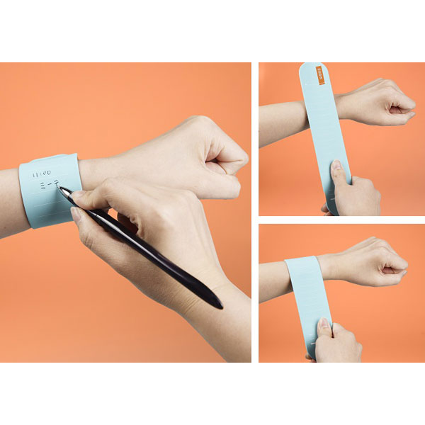 腕に巻き付けて使用するシリコンバンドタイプのウェアラブルメモです。「いつでも/どこでも 書ける/思い出せる」ことを目指して、現場最前線のワーカーのためにデザインしました。