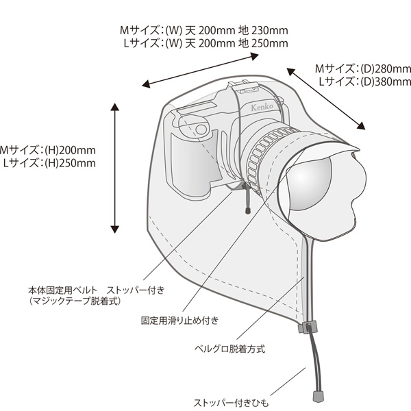 カメラをゴムバンドで固定するだけの簡単装着。背面には大型のPVC製の透明窓を採用し、ライブビュー時などの液晶モニターの視認性を向上させています。