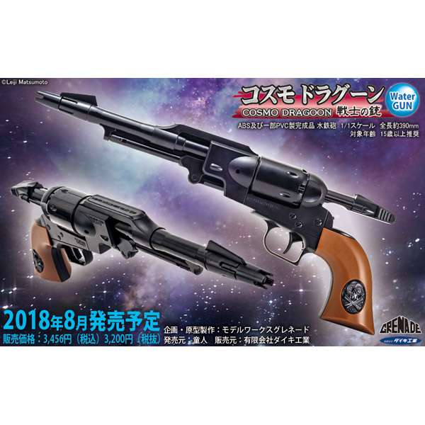 漫画界の巨匠 松本零士先生の作品に多数登場する戦士の銃「コスモ ドラグーン」を、松本零士先生原型監修のもと、各種イベントで活躍するモデルワークスグレネードの企画・原型製作により、水鉄砲となって製品化!