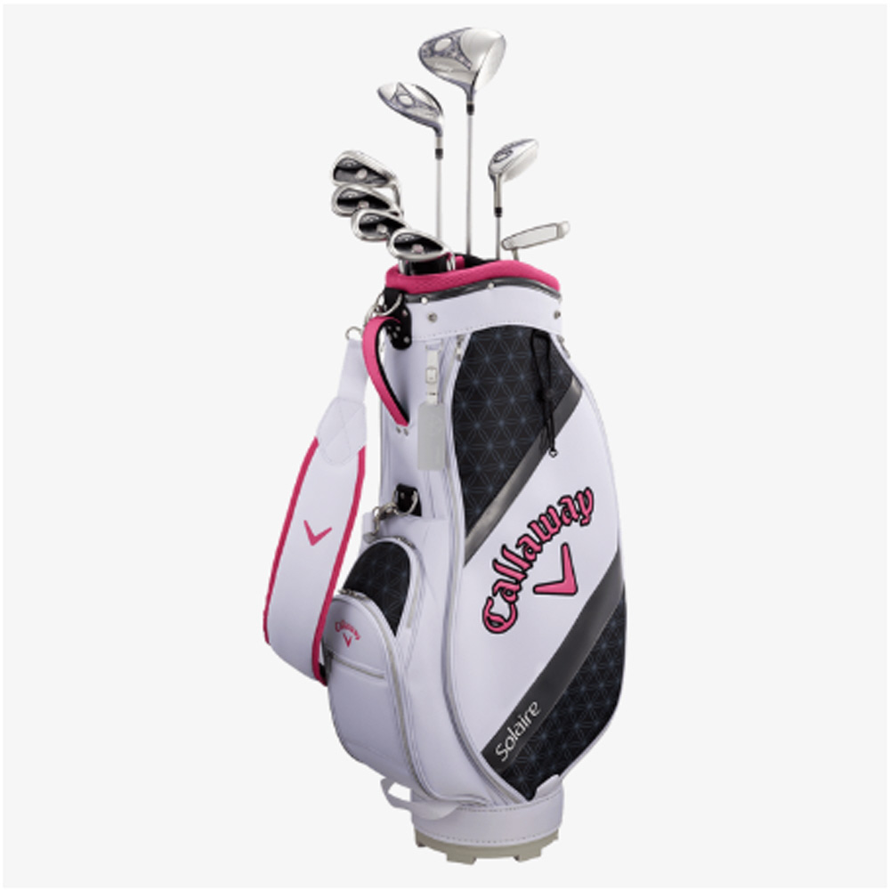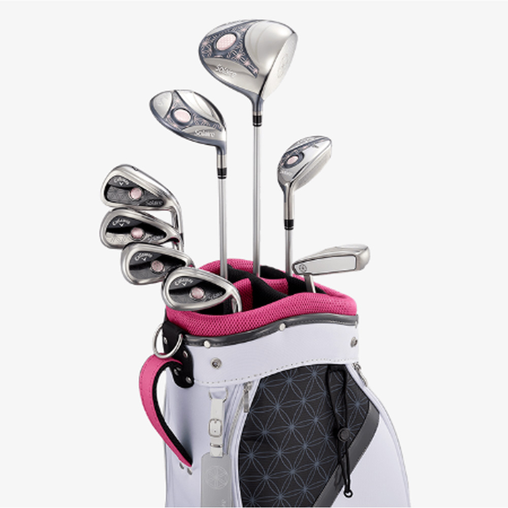 ゴルフを始めようという女性や初心者のレディースゴルファーを強力にサポートするSolaire(ソレイル)が、リニューアルされて登場です。ドライバーからパターまでの8本のセットに、ヘッドカバー、キャディバッグを組み合わせた、すぐにラウンドに飛び出せるパッケージ。キャロウェイのクラブ製作のノウハウが、打ちやすさ、気持ち良さを提供します。また、キャディバッグは、シンプルなデザイン、使い勝手のよさを追求。 Solaire(ソレイル)は、女性のゴルフライフをトータルにサポートします。