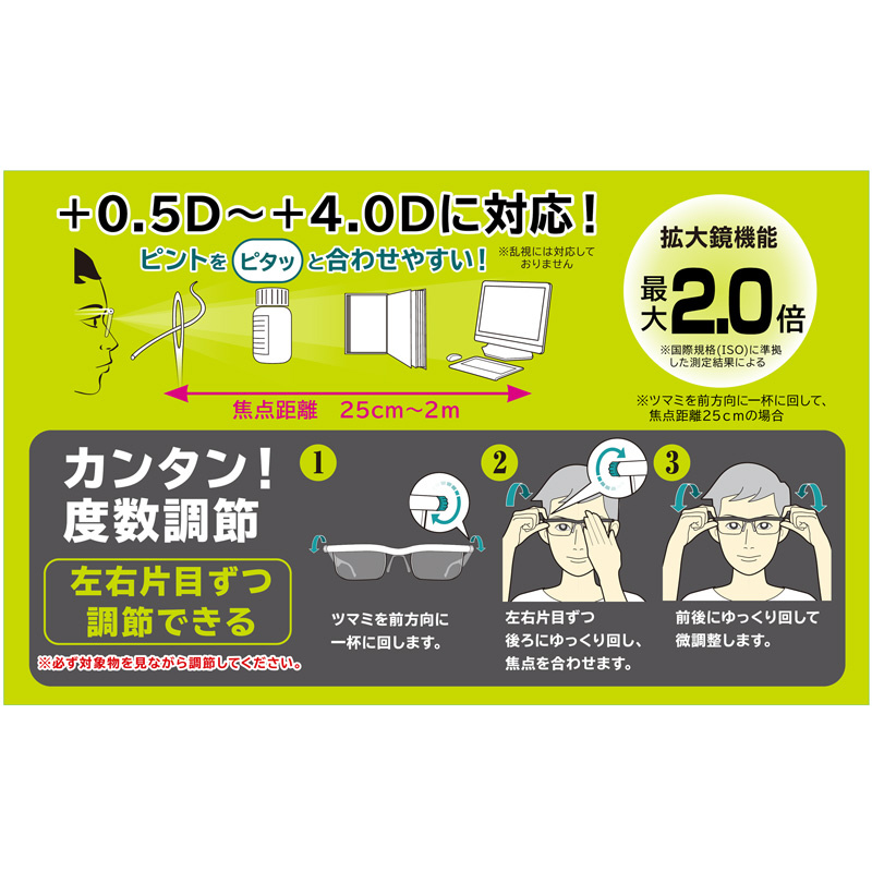 視力の変化に合わせて、度数を調整できるシニアグラスです。
