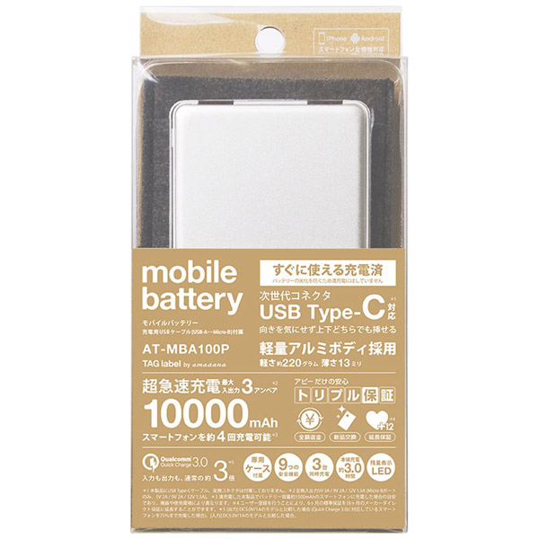 【在庫限り】 モバイルバッテリー mobile battery AT-MBA100P(SV) シルバー [10000mAh/microUSB/充電タイプ]
