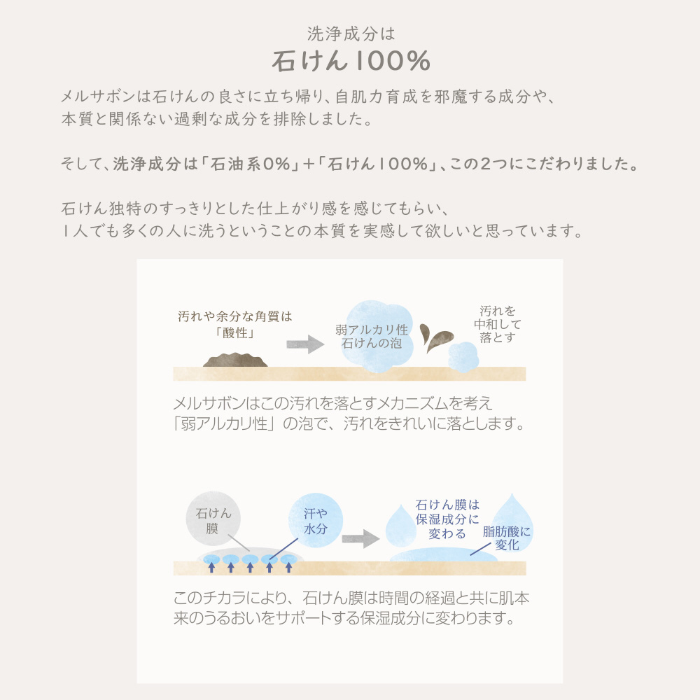 洗浄成分は石油系0% コールドプロセス製造の石けんを100%使用。肌をしっとり、なめらかに洗い上げます。石けんがやさしいうるおい膜に変わる、みずみずしいフローラルハーブの香り。詰め替え用